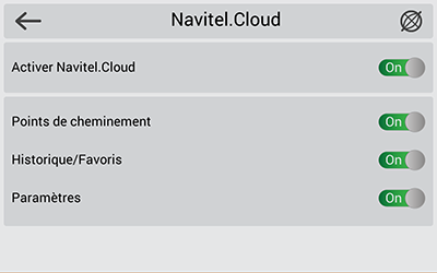 - Dans la boîte de dialogue Navitel.Cloud, sélectionnez Paramètres, puis sélectionnez les données que vous souhaitez synchroniser.