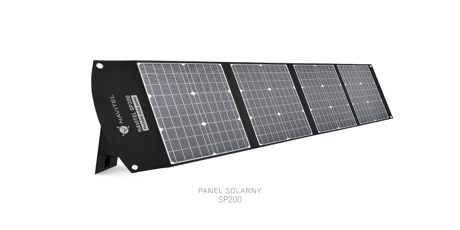 Stacje zasilania NS300, NS500 i NS1000 mogą być ładowane również poprzez panel solarny NAVITEL SP200. Jest to monokrystaliczny panel o mocy 200W, który przekształca do 22% energii słonecznej w darmową energię do wytwarzania prądu. Panel został wykonany z odpornej na zużycie tkaniny Oxford, o standardzie wodoodporności IP67. W kieszeni panelu znajduje się kontroler mocy ze złączem Andersona oraz portami USB-A i USB-C, które umożliwiają ładowanie urządzeń elektronicznych, np. smartfona, czy laptopa. Wygodę użytkowania oraz przenoszenia zapewniają składana konstrukcja, oraz rączka.