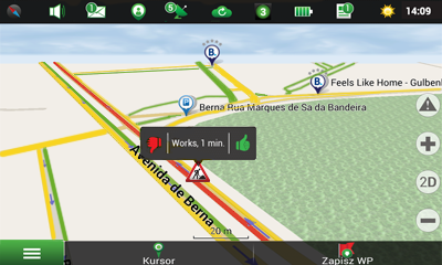 Em caso de presença policial rodoviária, com sistemas de controlo de velocidade, pode marcar este troço de estrada no mapa para avisar os outros usuários, sobre a necessidade de conduzir de forma segura e seguindo as regras de tráfego.