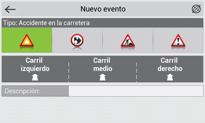Utilice este tipo de acontecimiento para marcar los accidentes en la carretera. Puede añadir una columna de información adicional, así como teclas de acceso rápido para mostrar la vía de circulación donde aconteció el accidente.
