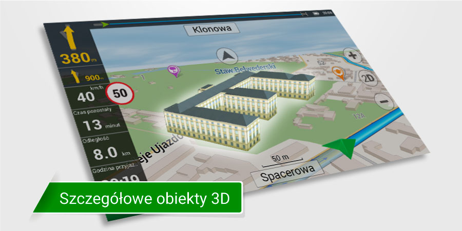 Wybierając nawigowanie w trybie 3D, na wyświetlaczu będą prezentowane obiekty trójwymiarowe z różnych państw. Dzięki realistycznemu projektowi modeli nie sposób będzie zabłądzić nawet w nieznanym otoczeniu. Baza danych obiektów 3D w Navitel Navigator uwzględnia obiekty użyteczności publicznej - muzea, boiska sportowe oraz główne zabytki.