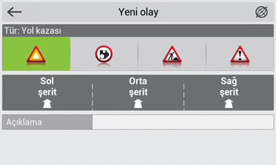Yol kazalarının işaretlemek için bu olay tipini kullanın. Yol kazasının olduğu trafik şeridini göstermek için ilave bilgi sütununu ve kısayol tuşlarını kullanabilirsiniz.